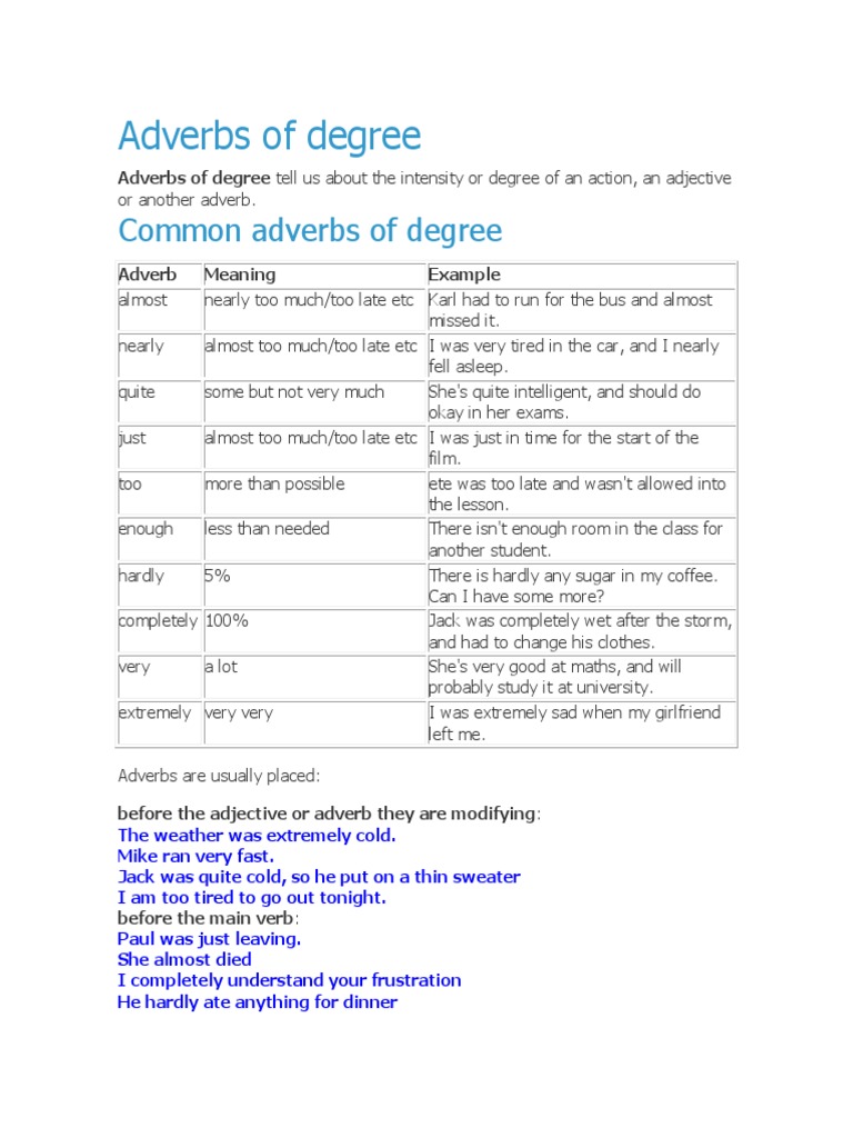 100 List Of Adverbs Of Degree Pdf Definition And Infographics Engdic from engdic.org Abate definition, to reduce in amount, degree, intensity, etc.; An adverb refers to any element in a sentence used to modify a verb, adjective, another adverb, or even an entire clause. Mild definition, amiably gentle or temperate in feeling or behavior toward others. Modifiers can either be adjectives, which modify nouns (or sometimes pronouns), or adverbs, which modify pretty much everything else (usually verbs, adjectives, and other adverbs). Describe the intensity, degree, or. Modifiers are, quite simply, any word or group of words that modifies (describes or elaborates upon) another element in a sentence. To abate a tax;to abate one's enthusiasm.